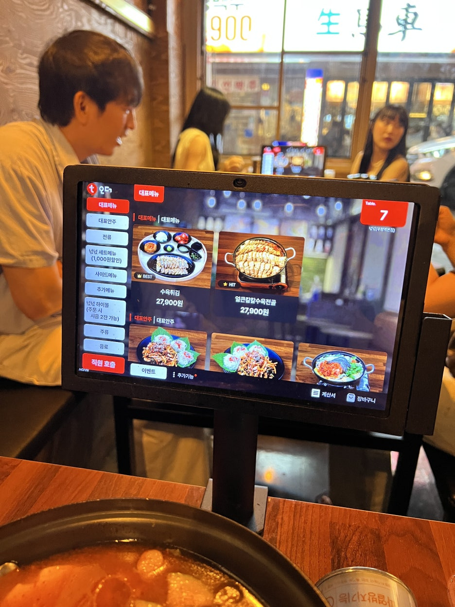 다양한 안주와 세트 메뉴가 준비되어 있었고, 태블릿 메뉴판으로 미리 확인할 수 있어서 주문도 간편했어요. 특히 꼬막무침+소면, 골뱅이무침+소면, 김치어묵탕+우동사리 같은 포차 감성 메뉴들이 인기 메뉴로 구성돼 있었습니다.