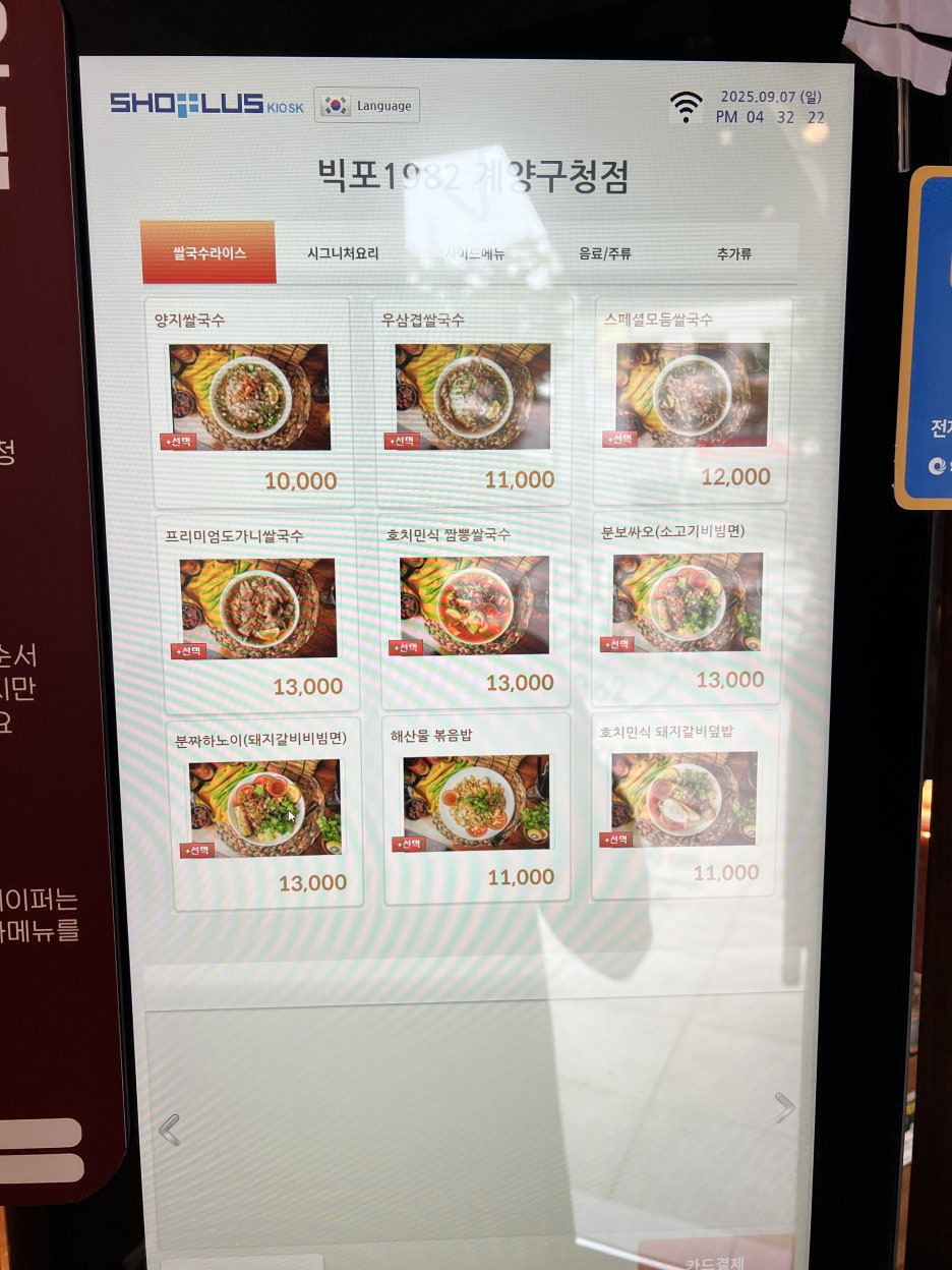 대표 메뉴로는 양지쌀국수(10,000원), 우삼겹쌀국수(11,000원), 스페셜모둠쌀국수(12,000원)가 있었고, 그 외에도 분짜, 볶음밥, 사이드로 스프링롤과 군만두 등 다양한 메뉴가 준비되어 있었습니다.