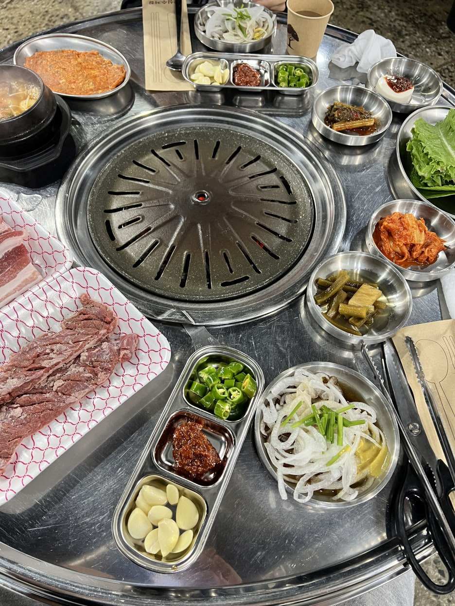 고기뿐만 아니라 밑반찬도 알차게 나옵니다. 기본 찬으로 김치, 쌈채소, 마늘, 고추, 양파절임 등이 나오고 된장찌개와 계란찜까지 함께 제공되어 푸짐하게 즐길 수 있었습니다.