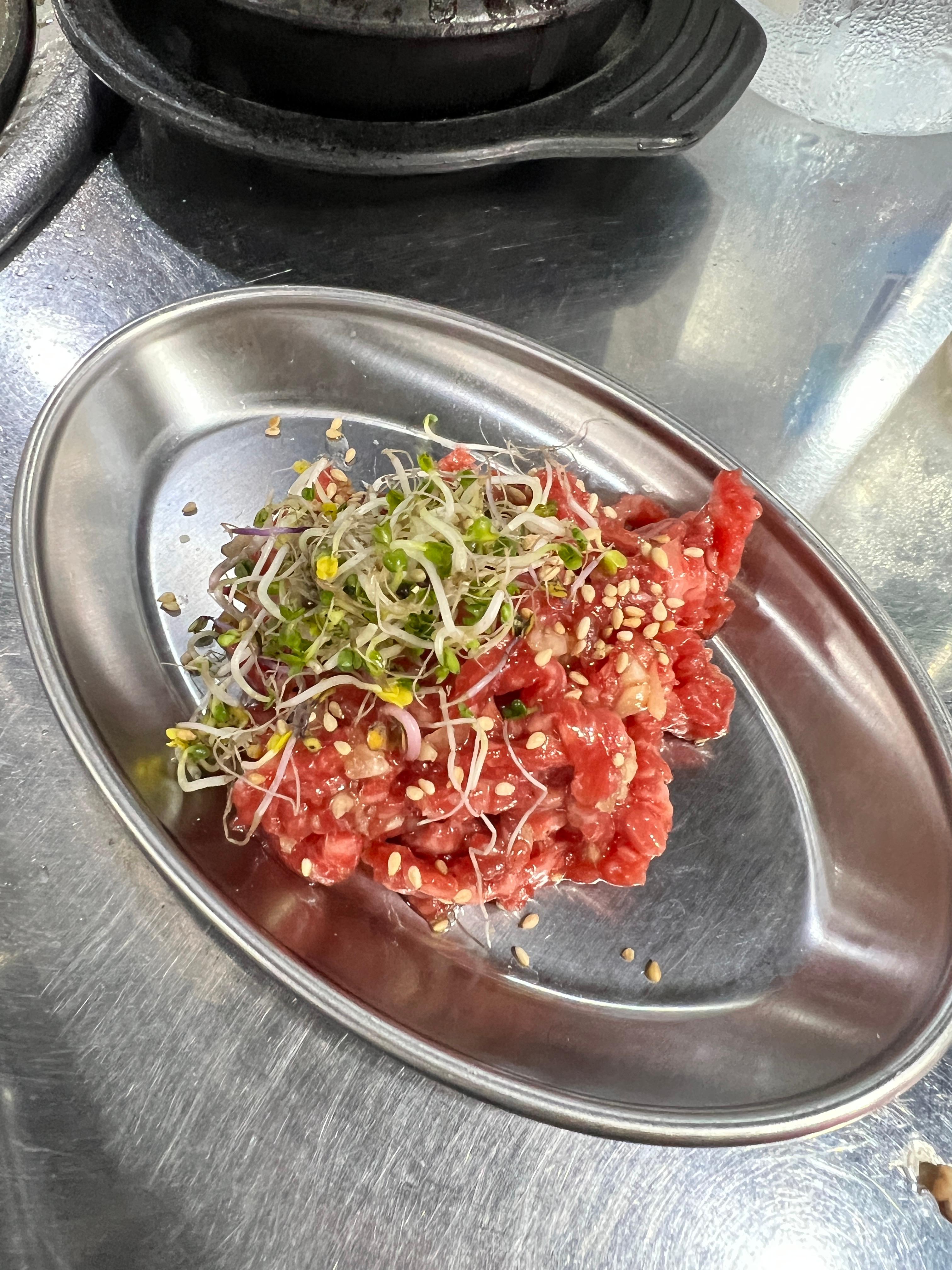 이 집의 별미 중 하나는 바로 육회였습니다. 신선한 소고기와 고소한 참기름, 깨소금이 어우러져 정말 입맛을 돋워줬습니다.