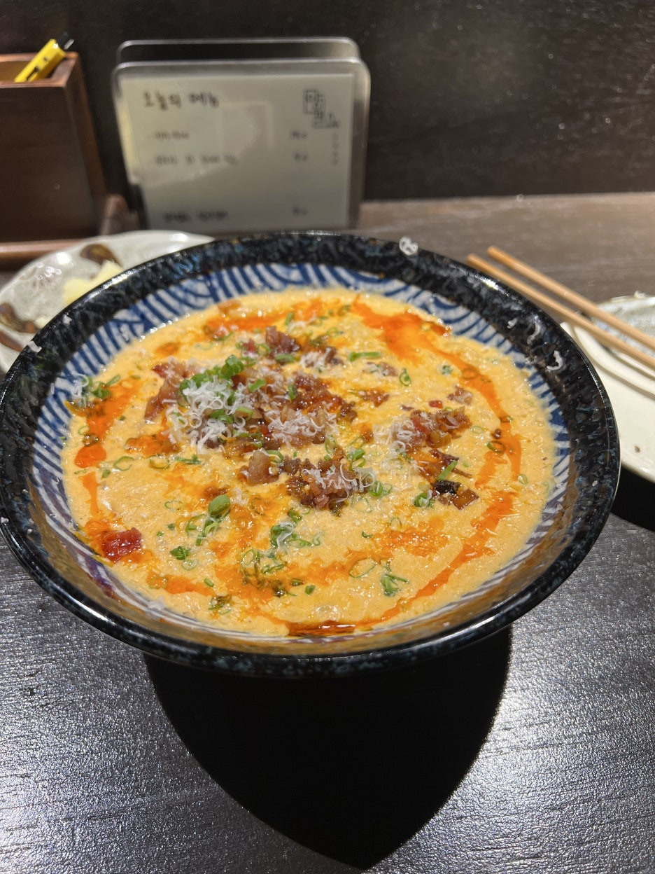 먼저 로제 수제비 파스타는 고소하면서도 매콤한 조화가 훌륭했습니다. 치킨 난반은 바삭한 튀김옷 속에 육즙이 가득해 식감이 정말 좋았고, 떡볶이는 한국식 매운맛과 일본식 소스의 밸런스가 잘 어우러져 술안주로 완벽했습니다. 눈꽃 라조유 교자는 얇고 바삭한 피에 육즙이 살아 있었고, 사케와의 조화도 탁월했어요.