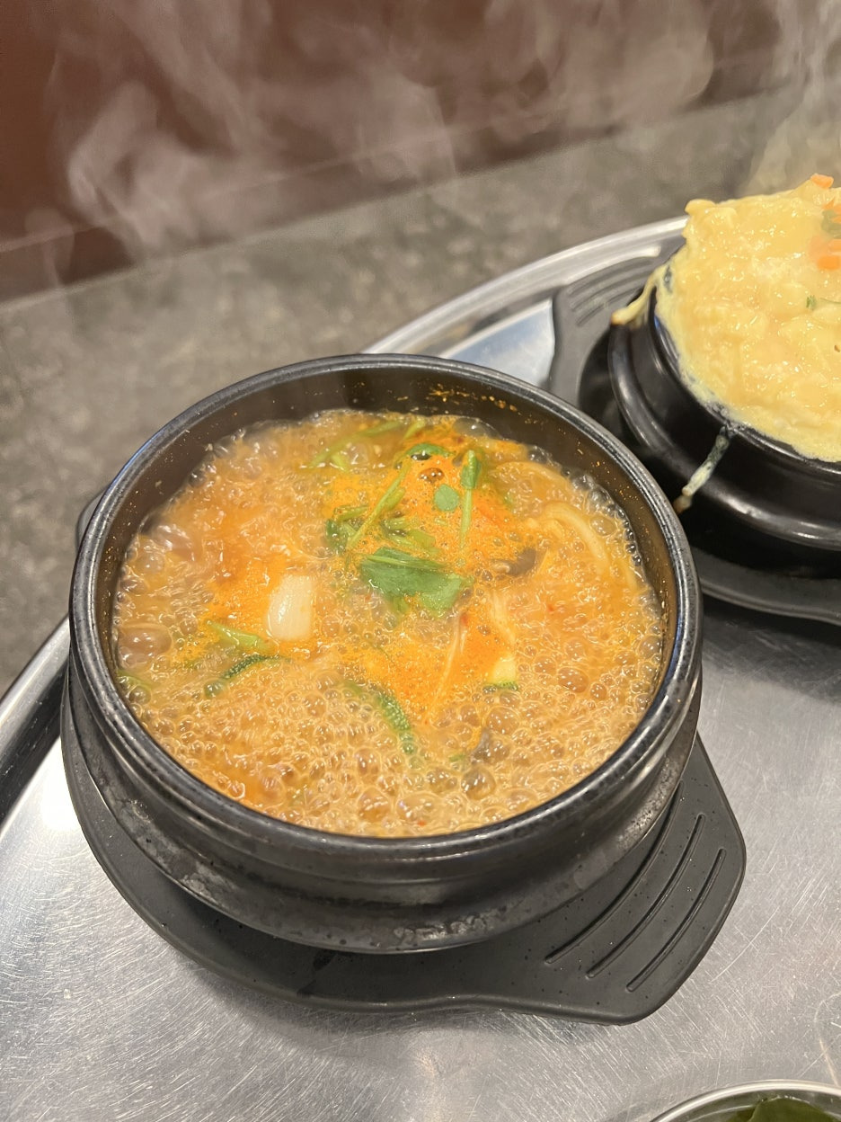 양푼비빔밥은 콩나물과 상추, 김가루가 듬뿍 들어가 고기와 함께 먹기 딱 좋았어요. 된장찌개는 바글바글 끓는 비주얼에 감칠맛이 진하고, 계란찜은 폭신하게 부풀어 올라 부드럽고 따뜻했습니다.
