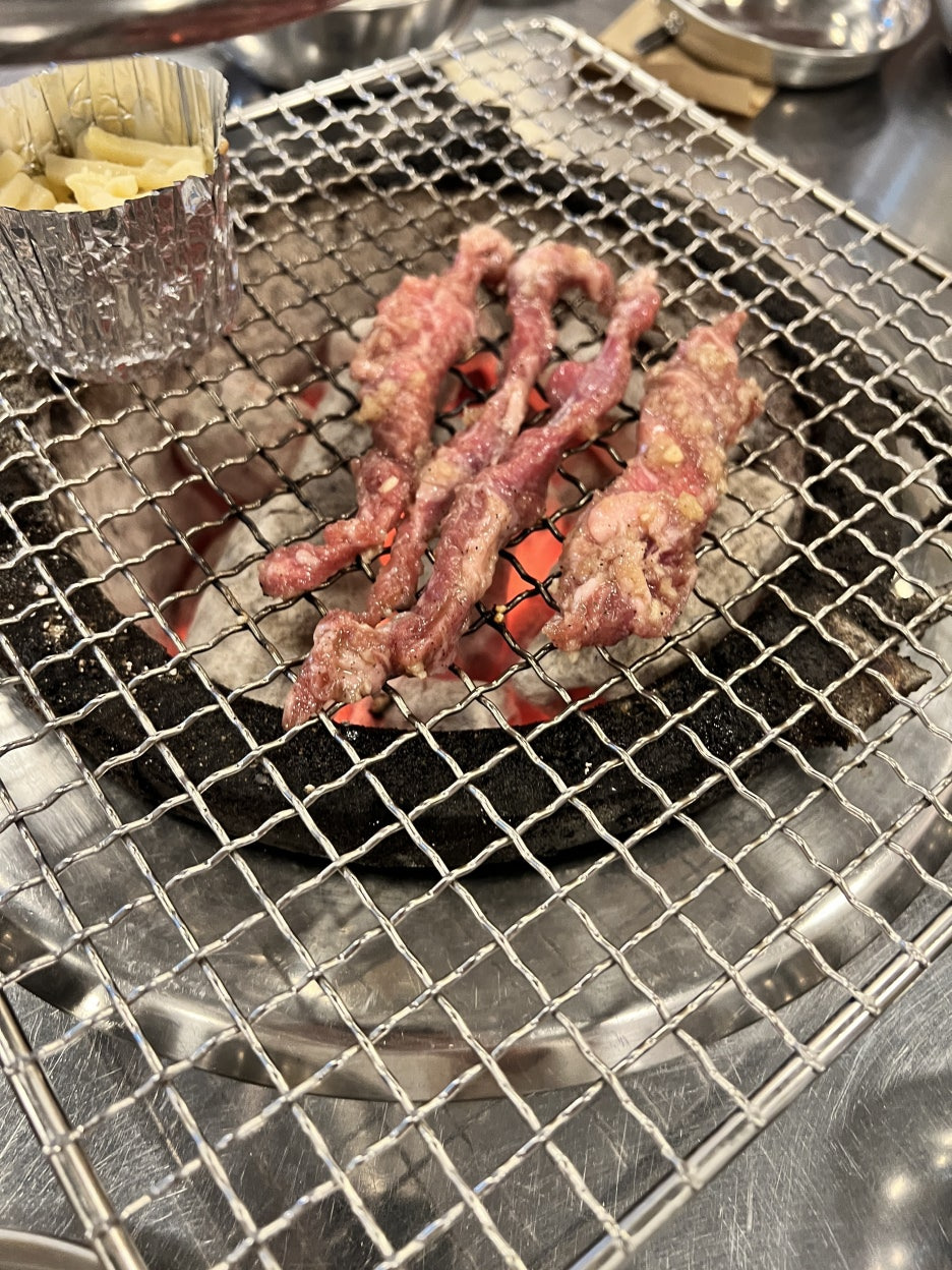 주문한 메뉴는 양념 갈매기살. 숯불 위에서 노릇하게 구워지는 향부터 압도적이에요. 불향과 달큼한 양념이 조화롭게 어우러져, 씹을수록 풍미가 진하게 퍼집니다. 함께 나오는 된장찌개는 고깃집 된장의 정석이라 부를 만큼 깊은 맛이 납니다.